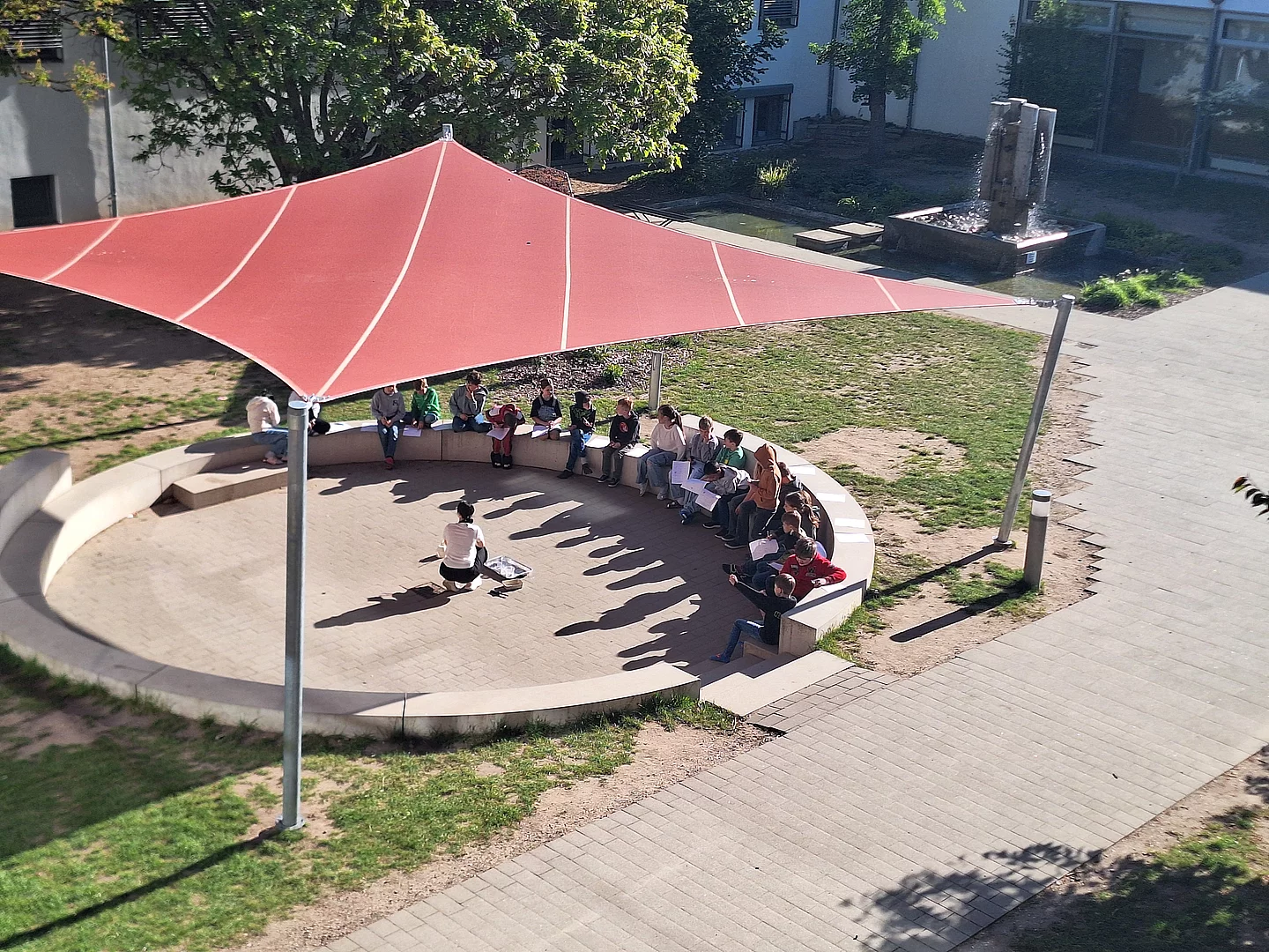 Unser „grünes Klassenzimmer” im Innenhof ist hierfür der ideale Lern- und Wohlfühlort. Schatten spendet das von der Stadt Teublitz neu angeschaffte riesige Sonnensegel.