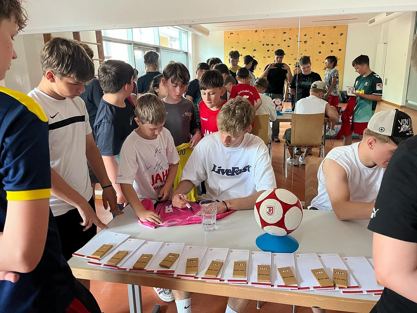 Unser AG Leiter Felix Bomber hat seine Connections spielen lassen und die beiden SSV Jahn Spieler Max Meyer und Leopold Wurm zu einer Autogramm- und Fragestunde an die Schule geholt. Die Schüler konnten den beiden Fragen stellen und im Anschluss Fotos mit ihnen machen und Fanartikel unterschreiben lassen. Zum Schluss haben sie mit ihnen noch ein kleines Fußballspiel gemacht. Die Kids waren mehr als begeistert.